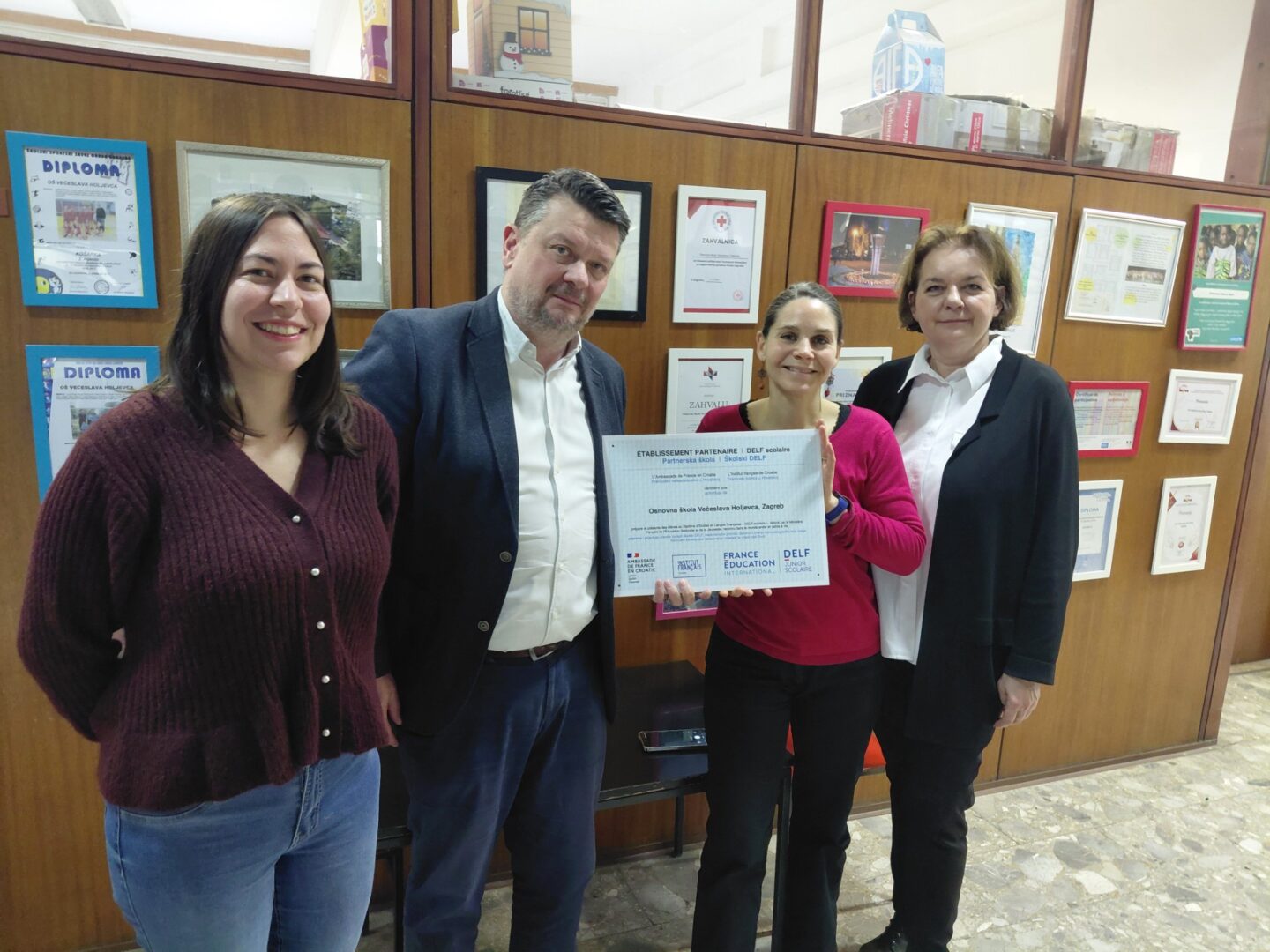Atašeica za obrazovnu i jezičnu suradnju Francuskog instituta u Hrvatskoj Lucile Chapiro uručila je 20. siječnja našoj školi plaketu DELF scolaire. Na taj je način nagradila i prepoznala rad i predanost naše škole i njezinih učitelja u poticanju učenika na učenje francuskog jezika kao i pripremi za polaganje međunarodnog ispita DELF junior scolaire. Plaketu su u ime škole primili ravnatelj Slaven Staklenac i učiteljica francuskog jezika Ema Pongrašić Plehan.